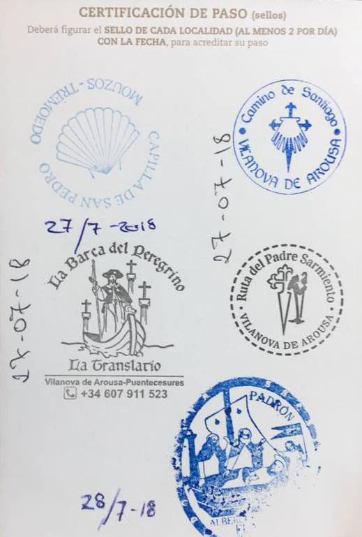 Earlier on it was possible to get the compostela for having completed your pilgrimage, even if you took the the legendary boat trip at Variante Espiritual. Unfortunately in 2018 there have been several incidents where pilgrims didn’t receive their compostela, because they had sailed part of the way. The reason for this is that the pilgrim’s office conditions a compostela on having walked the last 100 kms on foot with no help from any vehicle. They look for this boat stamp from “La Barca del Peregrino”: