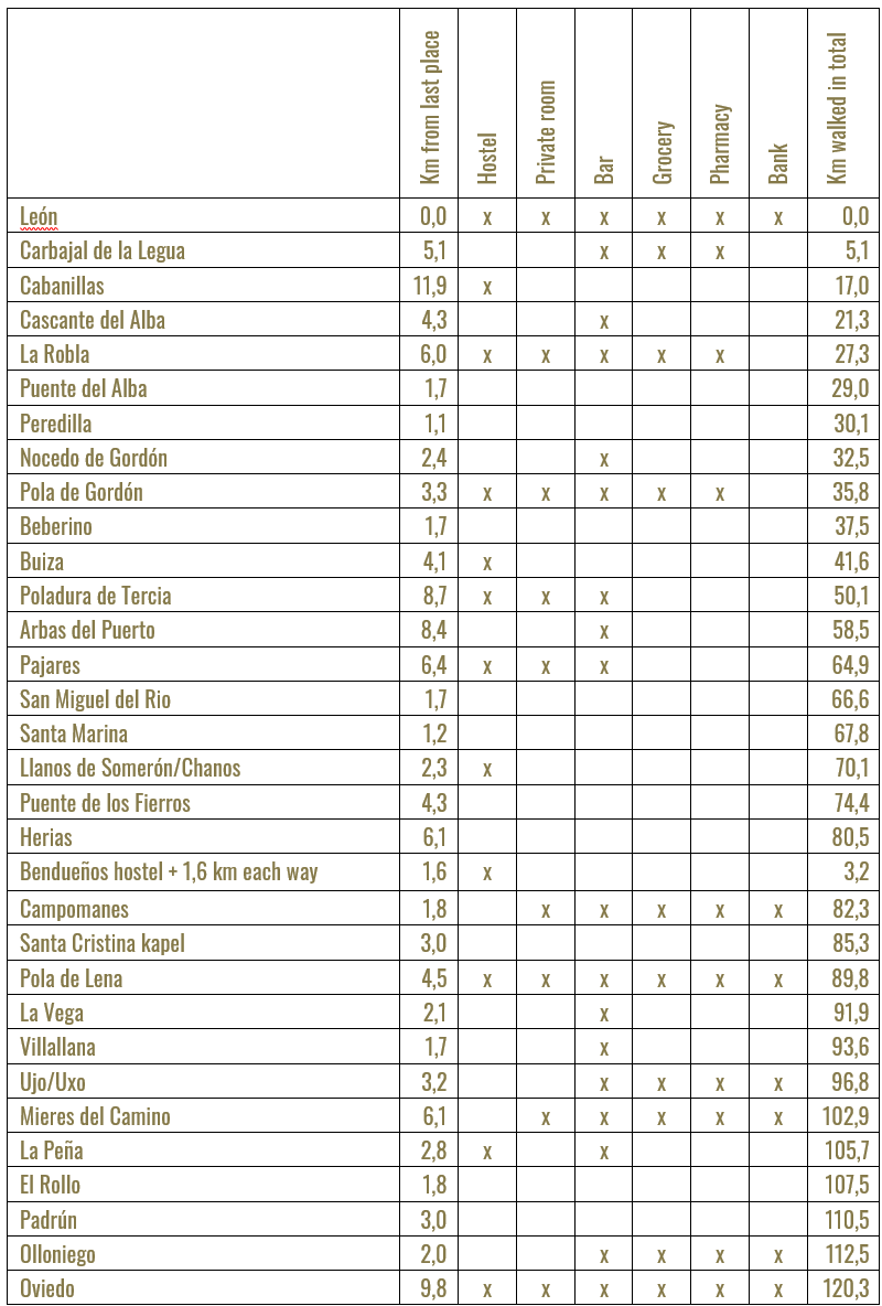 This should give you an idea about the distances and services available on Camino San Salvador: