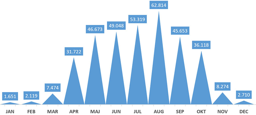 This graph shows the number of pilgrims arriving in Santiago each month: