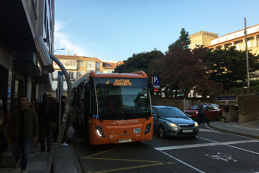 Choosing the airport shuttle service gets you from the city center to the airport for three euros in half an hour. You buy the ticket on the bus (cash only). The very central Plaza de Galicia is the best take off point. Find your way there easily with Google maps. There are two departures every hour – .30 and .00. There are no shuttle busses between 01.00-07.00 AM. A taxi to the airport costs about 18 euros.