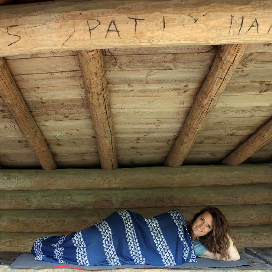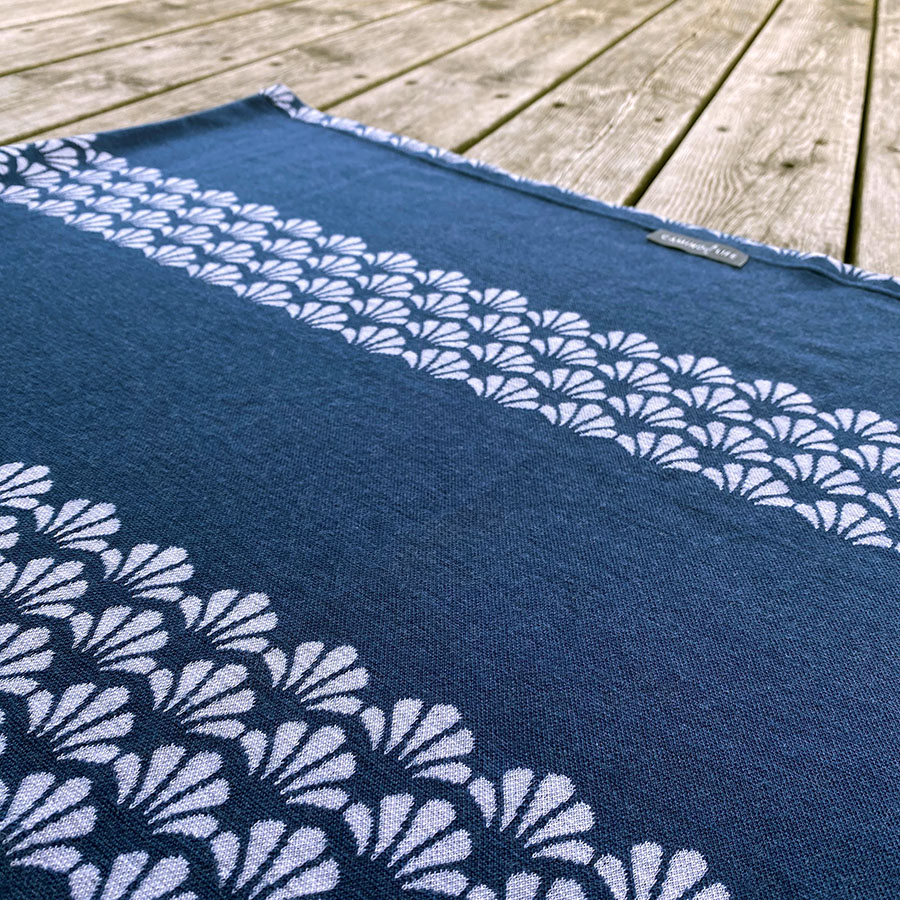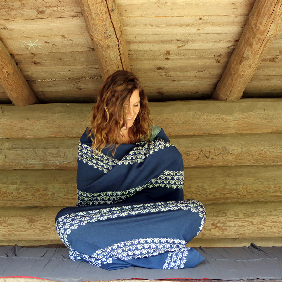 Have you experienced how soft merino wool is? We even sleep in merino wool when on the camino. This merino wool mummy liner os warm enough for the camino if you wear thick merino wool underneath. The pattern is a classic striped pattern made of camino shells – white shells on blue. If you prefer sleeping outdoor, the mummy liner works very well as extra warmth in your sleeping bag.