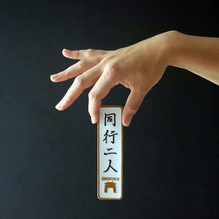 It is a simple Japanese design in black, white and gold. The text means ’Kūkai’ – the name of the monk and pilgrim who founded the Shikoku pilgrimage.