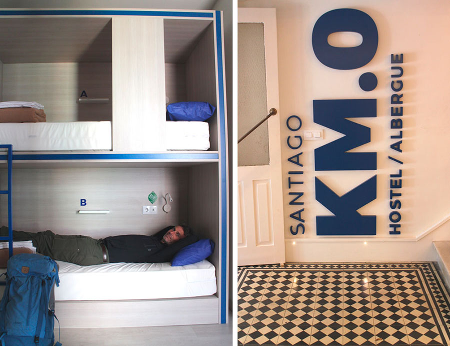 Its logo is five lines, symbolizing the five main caminos into Santiago. Look for them in the roof lighting as well. The price for a sleeping hall with 6 beds is 20 euros and 22 euros for a room with 4 beds. Book at KM0 here.