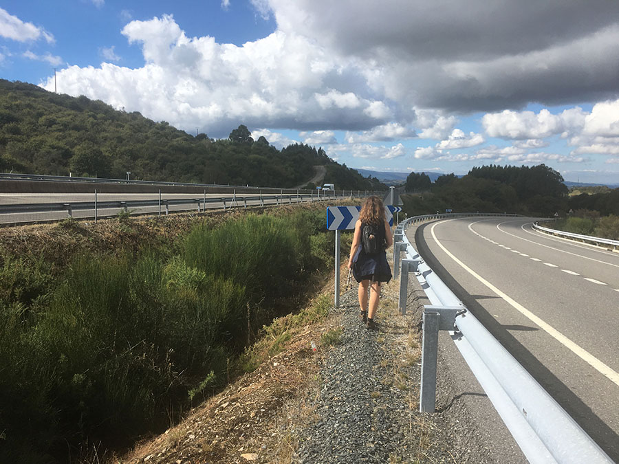 An unbelievable beautiful day ends in the first camino walk I ever took, during which I gladly invested 3 kilometer in a taxi. We walk along the road protected by a crash barrier on one side and another road on the other side.